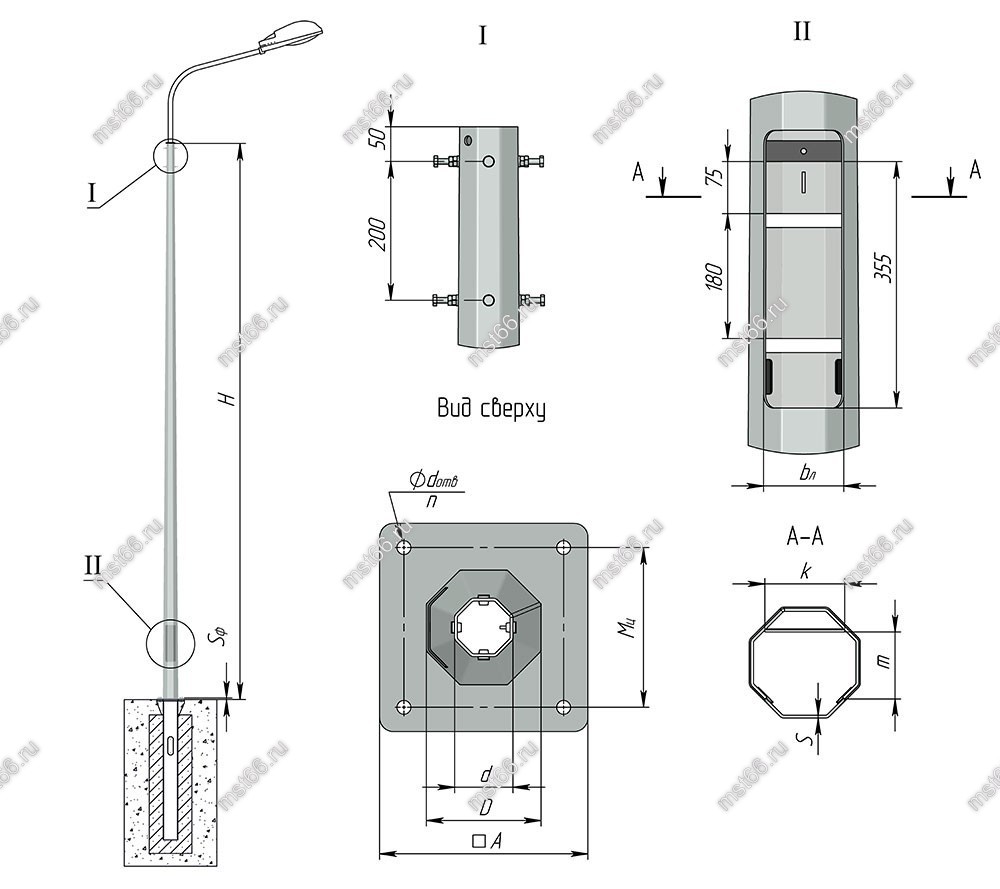 Опора освещения ОГК-14 монтируется на фланцевое основание с помощью резьбовых крепежных деталей метизов (болты, шпильки, гайки, шайбы), и требуют подготовленного фундамента при установке. ФМ заглубляют в бетонное основание фланцевой частью к верху. Возможен монтаж без фланца – при условии, что величина заглубления будет 2 м и более (для общей длины в десять метров).