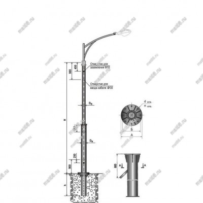 Установка фланцевых опор освещения ОСф-0,7-9,0 производится на железобетонное основание (фундамент). Он состоит из закладного металлического элемента (указан для каждого типа фланцев) и армированного бетона. При необходимости возможно применение выносной консоли. Основные параметры его определяются проектом или расчетом, и зависят от зоны эксплуатации и параметров грунта, ландшафта.